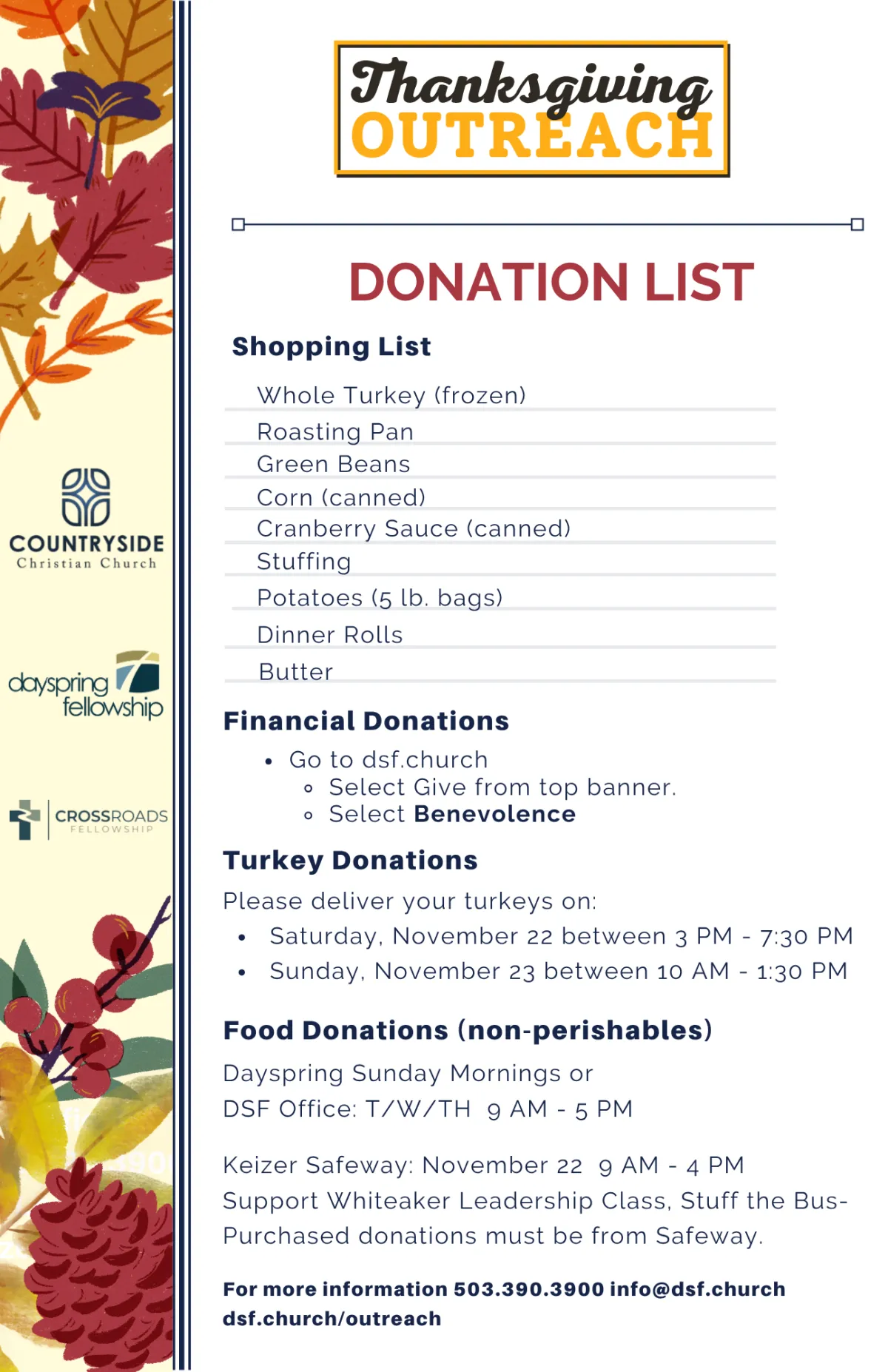 As we have for over 20 years, Dayspring Fellowship will be helping over 200 families in our Keizer area community by providing them with Thanksgiving Food boxes. There are many ways to participate in this outreach; from donating food, assembling and filling boxes, to actually delivering a food box to a family on November 23.
